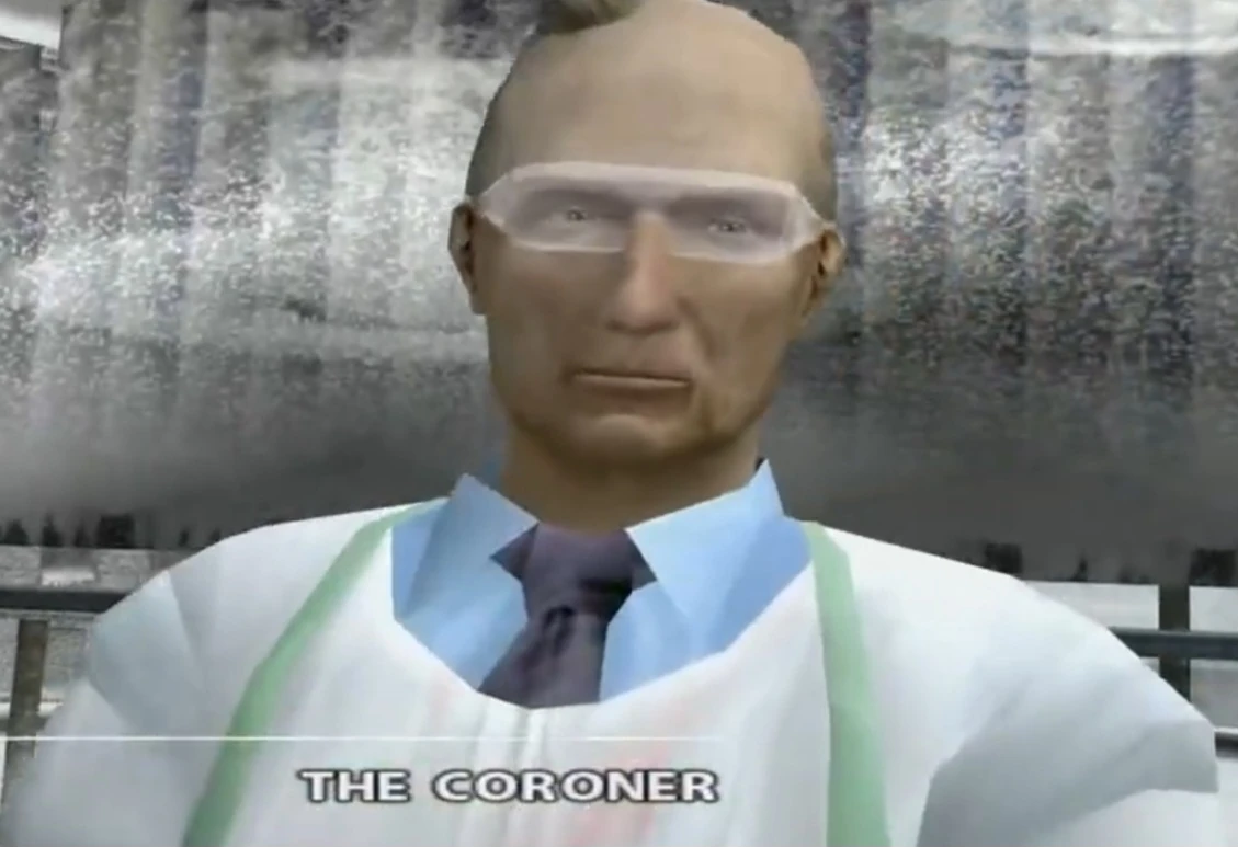 The Coroner is the man who examined the deceased body of John Winston while Carla Valenti observed in Fahrenheit: Indigo Prophecy. He appears as wearing a light blue collar shirt with a tie, green apron and gloves, safety glasses and is also balding.