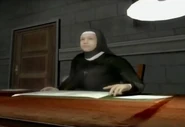 The Nun is seen near the end of the game, sitting at a desk near the entrance where she allows Lucas Kane and the Oracle to enter and shortly killed by the latter.